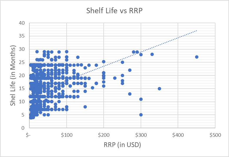 In looking at below graph, you can see that higher RRP sets tend to have slightly longer in shelf life. However, you can also see that majority of the sets have retired within 24 months, especially for sets below $150-$200 range.